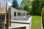 Stort trädäck som binder ihop huvudbyggnaden med pool och spabad samt övriga byggnader såsom växthus, uterum, loggia och förråd.