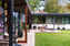Stor parkliknande tomt med gräsmatta, träd och häckar