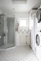Ljust kaklat badrum utrustat med duschkabin, toalett, handfat samt tvättmaskin och torkmaskin – praktiskt beläget på entréplan.