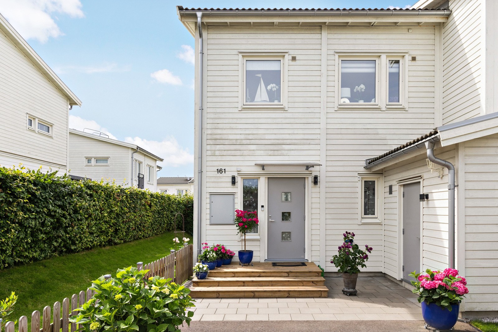 På Kaprifolvägen 161 bor ni i ett gavelradhus med optimal och funktionell planlösning. Planlösningen är öppen mellan kök och vardagsrum vilket ger stora luftiga ytor. Från vardagsrummet har du utgång till en stor och härlig terrass och den egna trädgården som dessutom går runt huset. Bostaden erbjuder ljusa och stilrena miljöer som är lätta att inreda och påkostade materialval. I bostaden finns två badrum varav en med egen tvättmaskin och torktumlare. Övre plan disponerar över tre stycken välplanerade sovrum, ett allrum som med fördel kan göras om till ett sovrum samt en generös klädkammare. Till bostaden ingår även en carport i länga samt ett förråd i direkt anslutning till huset.