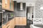 - Kök: Mörkfärgat laminatgolv med tapetserade väggar. Köket har ljusa skåpsluckor i trä, mörkbänkskiva med mörkfärgat stänkskydd som sträcker sig upp till taket. Utrymmet är utrustat med induktionshäll med fläkt, integrerad mikrovågsugn samt integrerad varmluftsugn, diskmaskin och diskho.