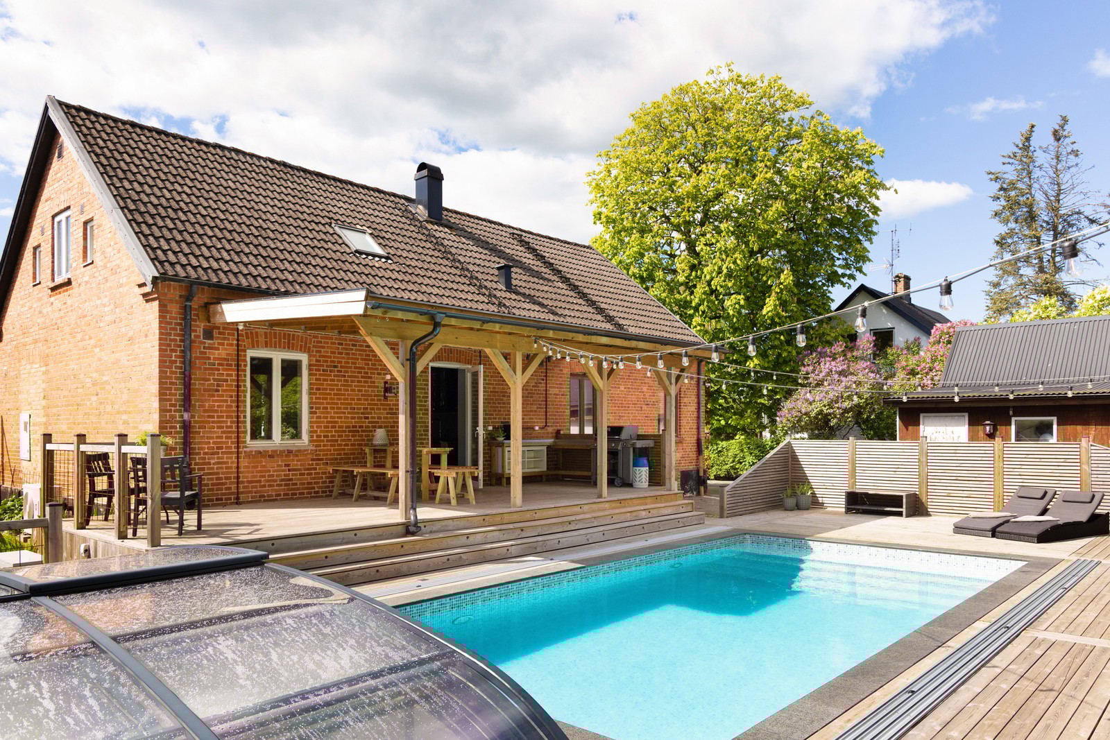 Gedigen stenvilla med skogen som granne i öster. Stort poolområde med trädäck och uteplatser runt om
