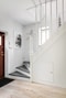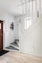 På golvet ligger parkettgolv. Ståtlig trappa till ovanvåningen. Rakt fram finns badrummet. I hallen finns plats för avhängning och dessutom förvaringsmöjligheter under trappan.