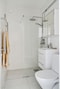 Badrummet är stilrent renoverat år 2021 med vit kakel, ljus klinker och moderna inslag. Här finns en praktisk duschhörna med glasvägg, kommod med handfat och spegelskåp för smart förvaring. Ett fräscht utrymme i tidlös design!