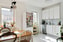 Det moderna köket i vitt erbjuder både funktion och form. Här finns gott om förvaringsutrymmen i stilrena skåp, bra arbetsytor samt all utrustning du behöver – inklusive diskmaskin, spis, fläkt samt kyl/frys. Inredningen har en minimalistisk design med lekfulla färgdetaljer som ger köket en unik karaktär.
