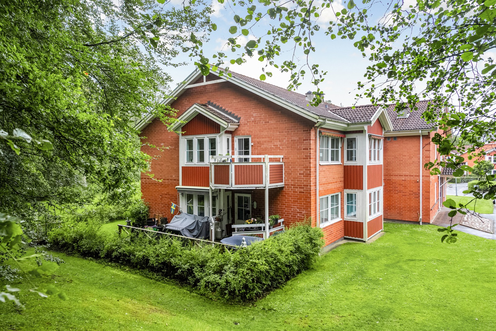 Till varje lägenhet ingår det två förråd, ett i huset och ett i garagebyggnaderna.