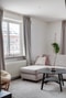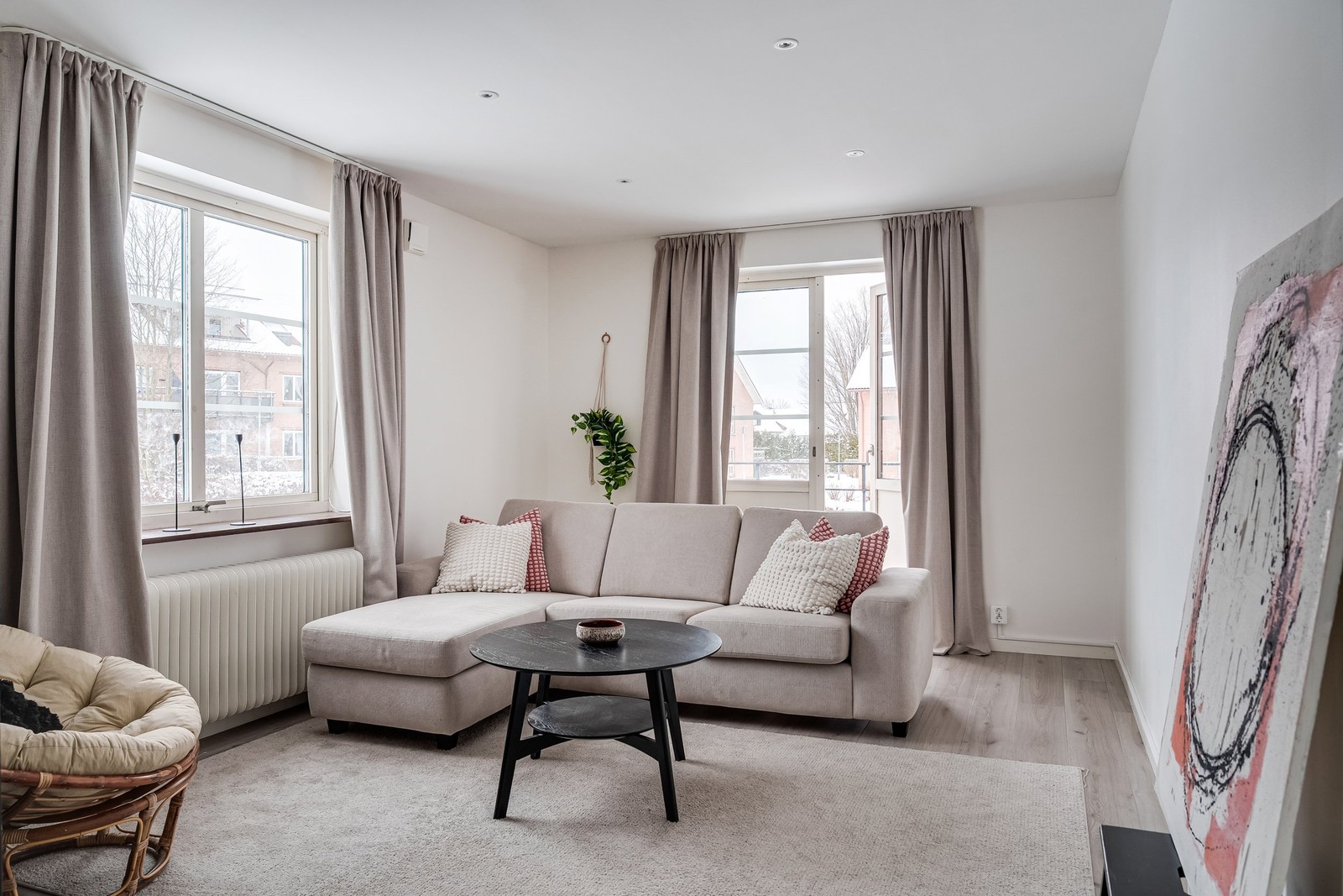 Vardagsrummet är luftigt och lättmöblerat med utrymme för både soffgrupp och matplats. Ljusa ytskikt tillsammans med den mjuka övergången mot hallen skapar en varm och hemtrevlig känsla. Härifrån nås även hallen i bästa söderläge.