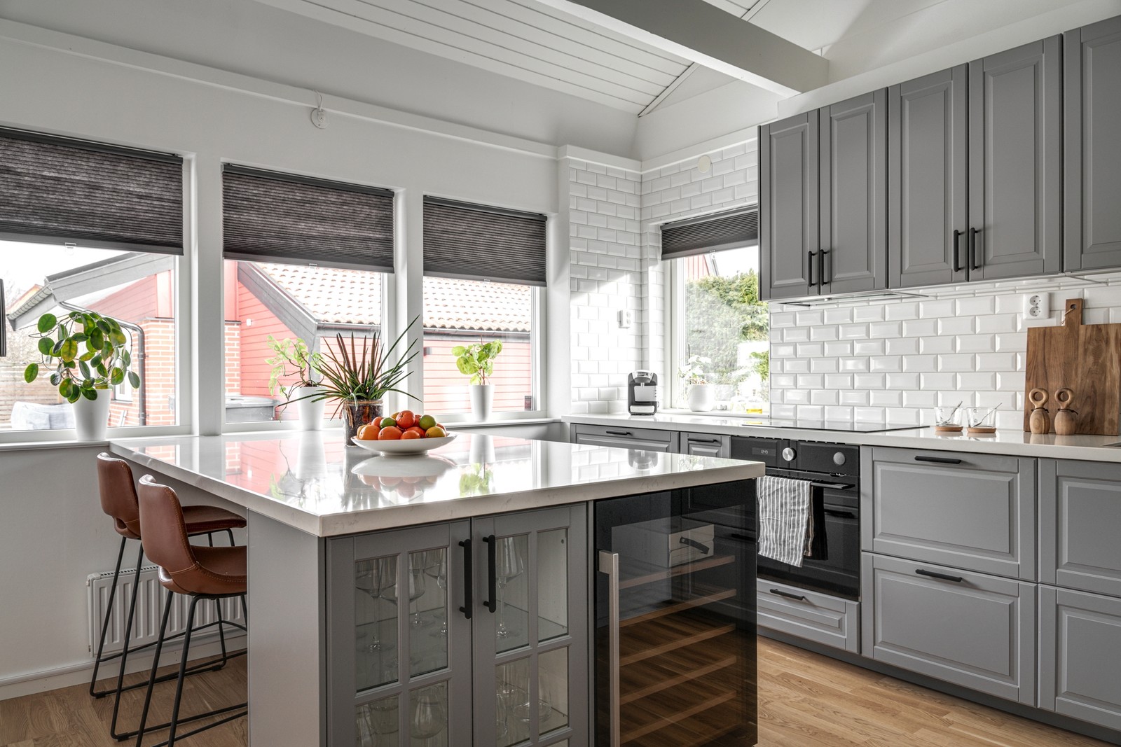 Välkomna till Alfavägen 12 som ligger på ett barnvänlig område med både lekplatser och grönområde på nära håll att utforska. Vi stiger in i entrén där plats finns in till höger att hänga av sina ytterkläder och på golvet ligger ett praktiskt klinkergolv. Vidare in så ligger till höger det renoverade köket från IKEA med gråa luckor, bänkskiva i sten och kaklat stänkskydd i vitt. Stor härlig köksö i centrum av köket vilket ger goda arbetsytor och förvaring. Här finns även vinkylen placerad och matplats för två. Köket bjuder vidare på fläkt, integrerad kyl/frys, mikro, ugn, diskmaskin och spishäll. Ett helt underbart kök där man gärna tillreder god middagar till släkt och vänner. Från köket kommer vi även in till ett av sovrummen på detta plan med god förvaring i flera garderober och plats för dubbelsäng.