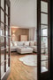 Vardagsrummet präglas av ett vackert ljusinsläpp, där det upphöjda läget ger en känsla av frihet och lugn. Här skapas en självklar inramning för både vardag och avslappning, med plats för större sällskap utan att tumma på hemmets intima känsla.