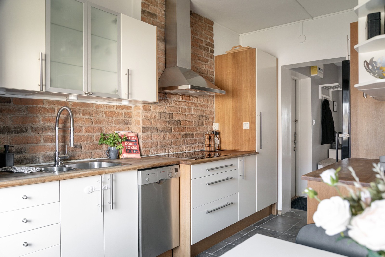 På Gethornkroken 11A finns nu denna mycket luftiga och trevliga trerumslägenhet till salu. In kommer ni via den alltid låsta porten som öppnas med tagg och finner sedan den aktuella bostaden på våning tre. Väl innanför dörren möts ni av en stor möblerbar hall med praktiskt klinkergolv. Här hänger man av sig ytterkläderna in till vänster eller i den väl tilltagna klädkammaren. Från hallen löper klinkergolvet vidare in i köket vilket bilder samman rummen. Köket är från IKEA och bjuder på träbänkskiva, vita luckor och en underbar väggsten som stänkskydd. Här har man gott om förvaringsmöjligheter i skåpen och allt man behöver så som diskmaskin, kyl/frys, fläkt, inbyggnadsmikro och ugn samt spishäll. Plats för matbord utmed fönstret som vetter ut mot entrésidan av huset.