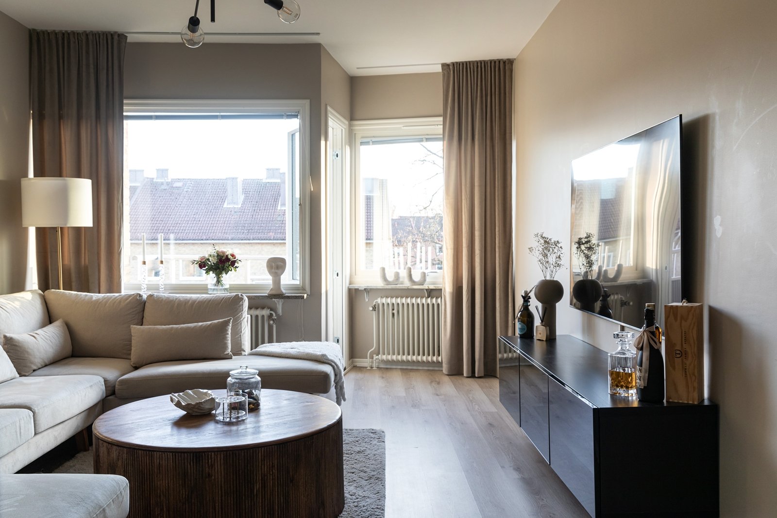 Vardagsrummet som idag inredds med stor soffa kan såklart om man önskar även möbleras med både matbord och soffa. Samma genomgående golv och väggar som i resten av lägenheten. Här umgås man mer än gärna och kommer även ut till den mysiga balkongen under tak!
