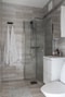 Badrummet ligger i bostadens mitt med italienskt kakel och klinkers. Dusch med duschväggar, handfat med underskåp, spegelskåp samt toalett finns här.