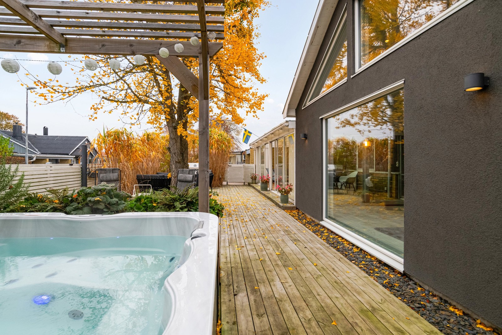 I ett lugnt och familjevänligt kvarter möter du ett hem där ljuset, rymden och harmonin står i centrum. Här bor du i ett enplanshus med smakfulla materialval, välplanerade ytor och en känsla av balans mellan det moderna och det hemtrevliga. Det stora vardagsrummet med öppet upp i nock, braskamin och generösa fönsterpartier suddar ut gränsen mellan inne och ute, och öppnar upp mot det inglasade uterummet och den privata uteplatsen med spabad – en plats skapad för avkoppling, middagar och långa sommarkvällar.