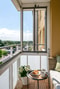 Köket är stilrent med bra arbetsytor och förvaring i både över och underskåp. Köket är utrustat med kyl/frys, vask, diskmaskin, spishäll och ugn. Här finns det även plats för ett köksbord. I anslutning till köket finns även en inglasad balkong med utsikt över området.