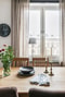 Lägenheten präglas av ett fint ljusinsläpp, generös takhöjd och en genomgående harmonisk färgskala. Det rymliga allrummet rymmer med lätthet både säng, soffa och arbetsplats utan att kompromissa med känslan av rymd. Köket är separat och välutrustat med goda arbetsytor och plats för matbord – ett ovanligt och eftertraktat plus i denna storleksklass.