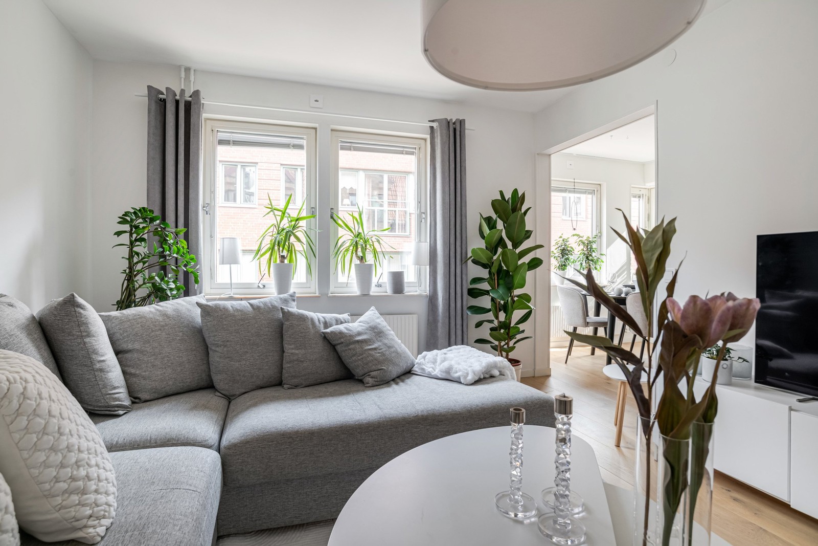 Vita väggar och ekparkett på golvet. Stora fönster med djupa fönsterbänkar i natursten ger fint ljusinsläpp. Rummet ligger i fil med köket och skapar en öppen och social känsla.
