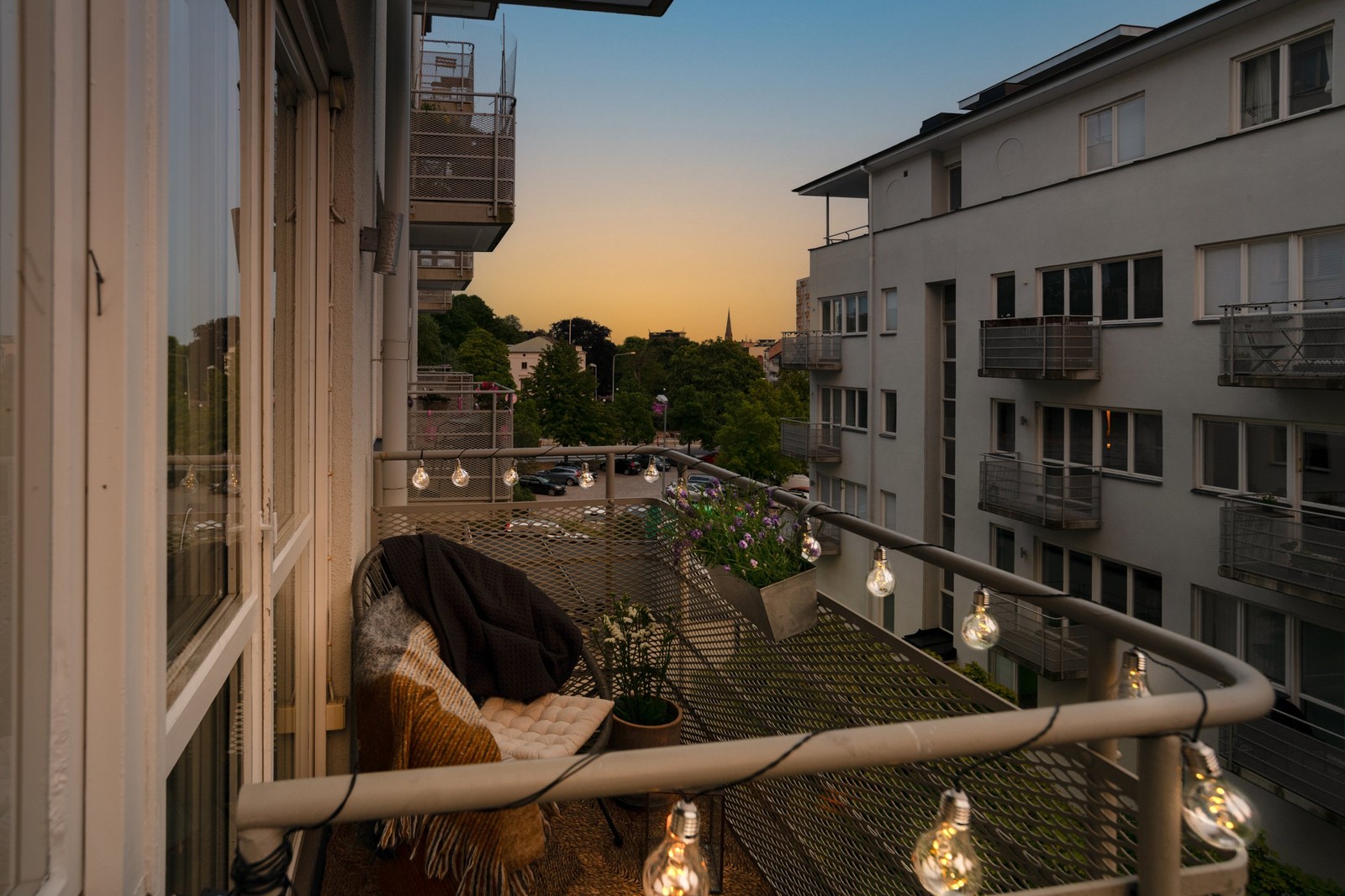 Från lägenhetens härliga balkong i soligt västerläge med dubbeldörrar har ni många soltimmar från eftermiddagen och framåt vilket ger en lugn och rofylld atmosfär. Balkongen erbjuder gott om plats för att skapa en mysig avkoppling eller middag med vänner.