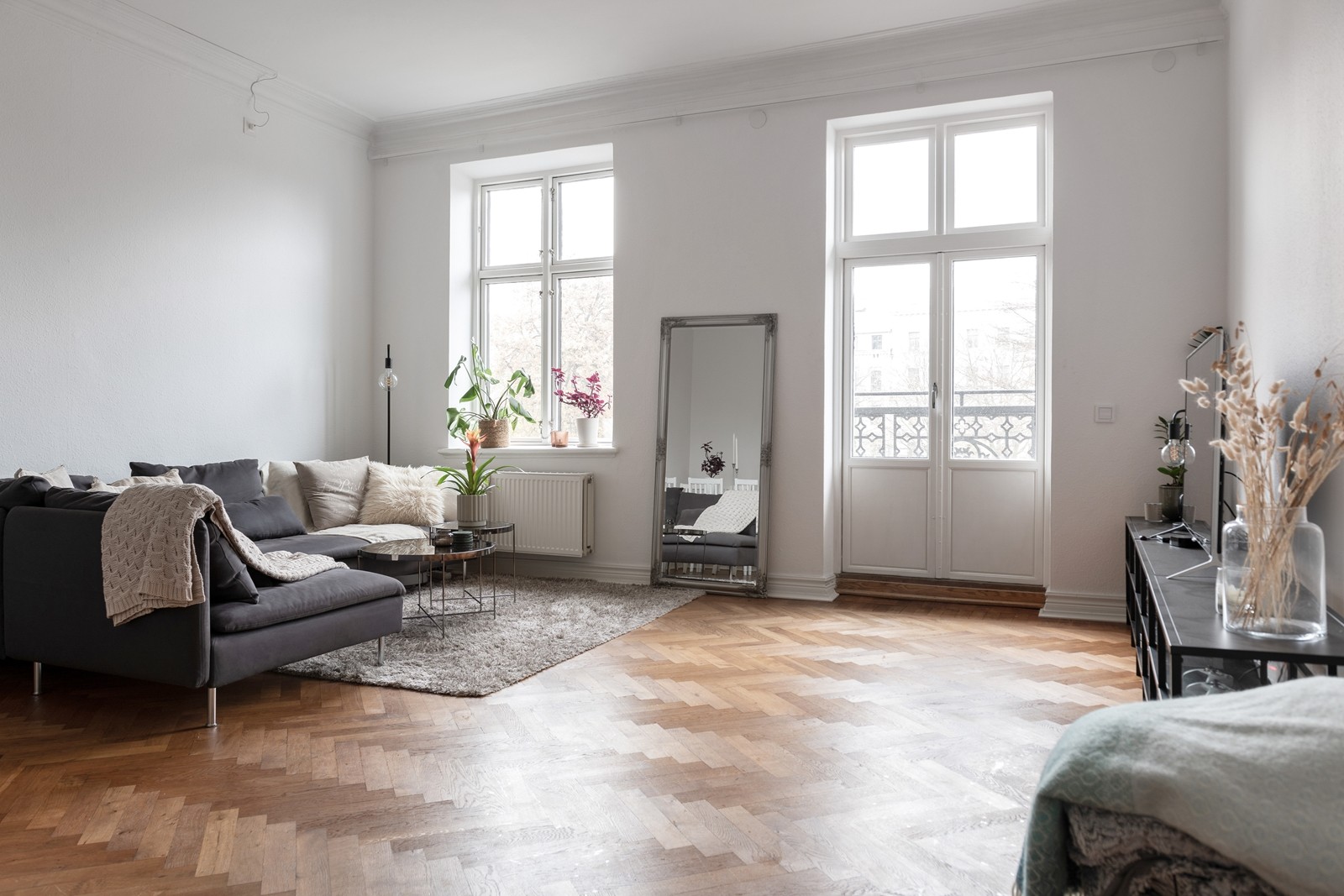 Vardagsrummet är rymligt och har ett välhållet parkettgolv, takrosetter och stora vackra fönsterpartier som skänker ett behagligt ljusinsläpp. Från vardagsrummet tar ni er ut på balkongen.