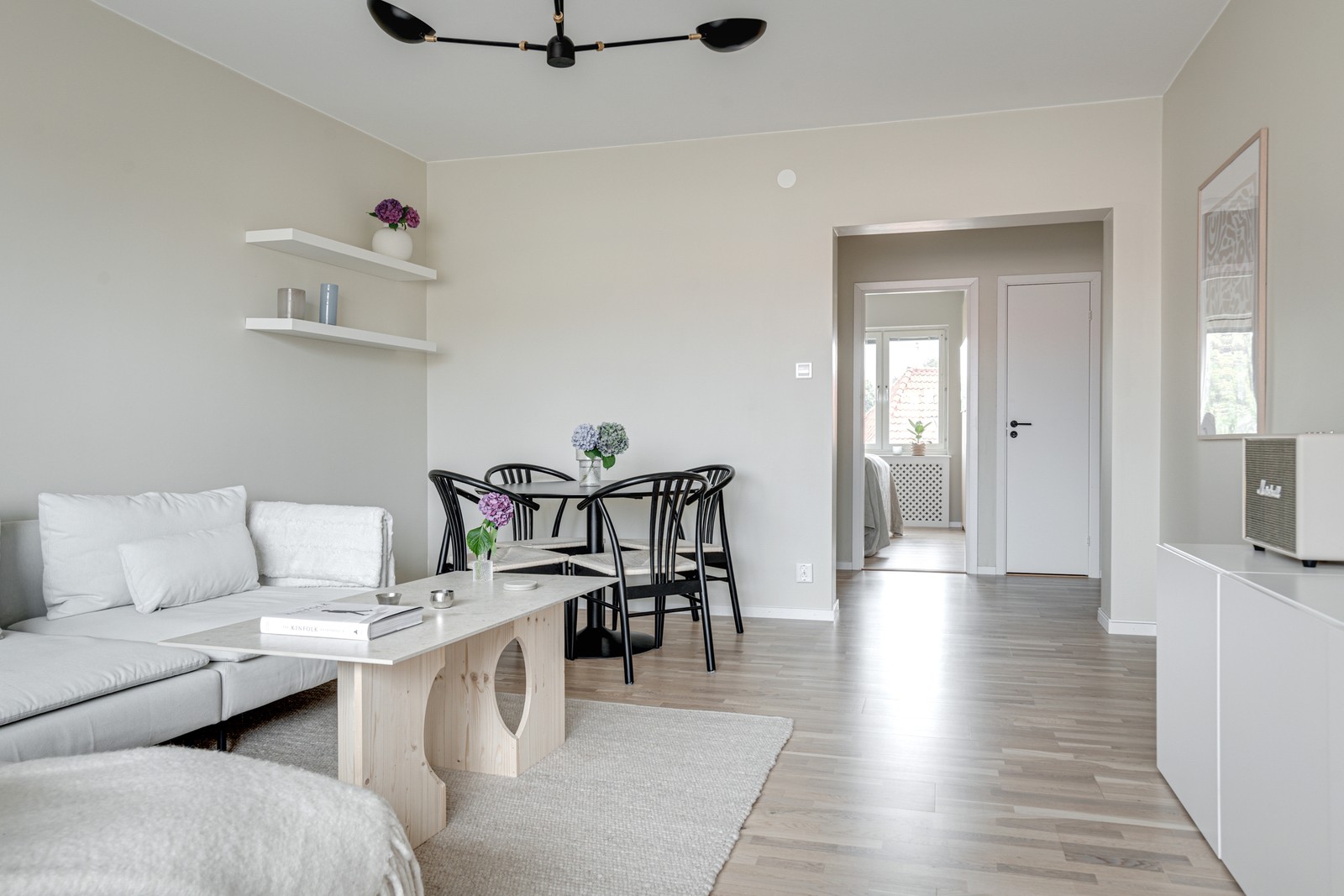Det ljusa och luftiga vardagsrummet bjuder in till umgänge med vänner och familj, här får du enkelt plats med både soffgrupp och matgrupp om så önskas. Från vardagsrummet når du den rymliga och inglasade balkongen belägen i solsäkert läge.