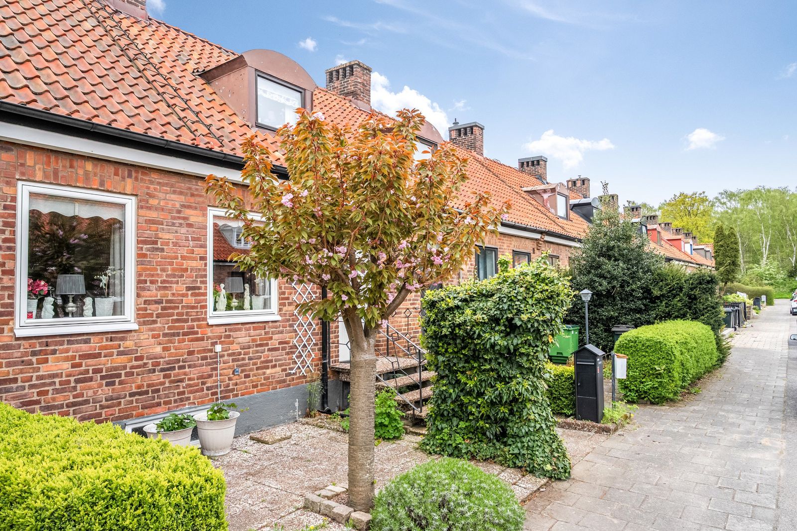 Charmigt engelskt radhus i tre plan med stort inglasat uterum och insynsskyddad trädgård i söderläge