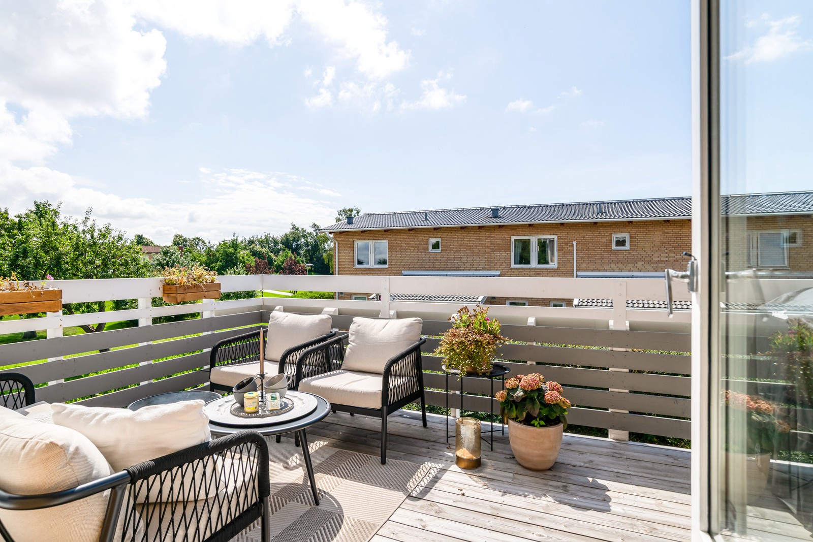 Terrassen i söderläge är en av bostadens stora höjdpunkter – med plats för både sittgrupp och matbord på ett insynsskyddat läge och fri utsikt över den stora gröningen. Här finns även möjlighet att grilla och njuta av ljumma sommarkvällar i trevligt sällskap.