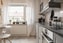 Till vänster om hallen finner vi det stilrena köket, klätt i grå luckor och ljusgrått kakel ovan en mörk bänkskiva i laminat. Ljuset flödar in genom två fönster, och här får du plats med ett större matbord för 4-6 personer. Maskinparken består av en integrerad diskmaskin, kyl/frys, spishäll, fläkt, en inbyggnadsugn samt inbyggnadsmkro.