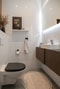 Bakom den första av bostadens många vita, stiliserade spegeldörrar med svarta trycken ligger ett smakfullt gäst-wc. Här finns vitt helkakel, kalkstensfärgad klinker med inslag av ribbträ på fondvägg och kommod. Badrummet vägghängd wc, fristående handfat samt spegel med touchkontroll.