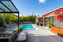 Utanför vinterträdgården/uterummet överraskar villan totalt med sin smått spektakulära utemiljö, till stor del belagd med trädäck och med en spännande rumslighet. Kvällssolen faller in genom bambu och annan grönska som skyddar poolområdet tillsammans med ribbträplank. Här finns en lounge under tak och platsbyggda sittbänkar. När poolbelysningen tänds glittrar poolen i blått och stämningen är som på en resort. Intill loungen finns ett stort spabad under en pergola.