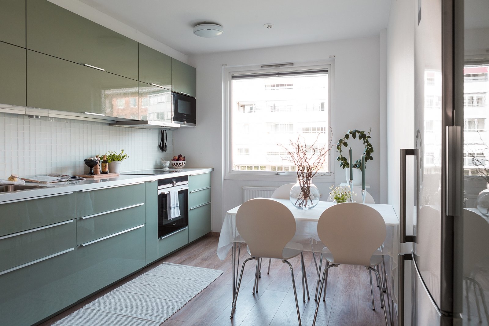 Kök: Ljust och praktiskt kök från 2018 med ljusgröna blanka luckor. Bänkskiva i laminat och småkakel på väggarna. Maskinpark består av Induktionshäll, varmluftsugn, kyl och frys, mikro, mekanisk fläkt och diskmaskin. Här finns plats för matbord för ca 4 personer. Laminatgolv och vitmålade väggar.