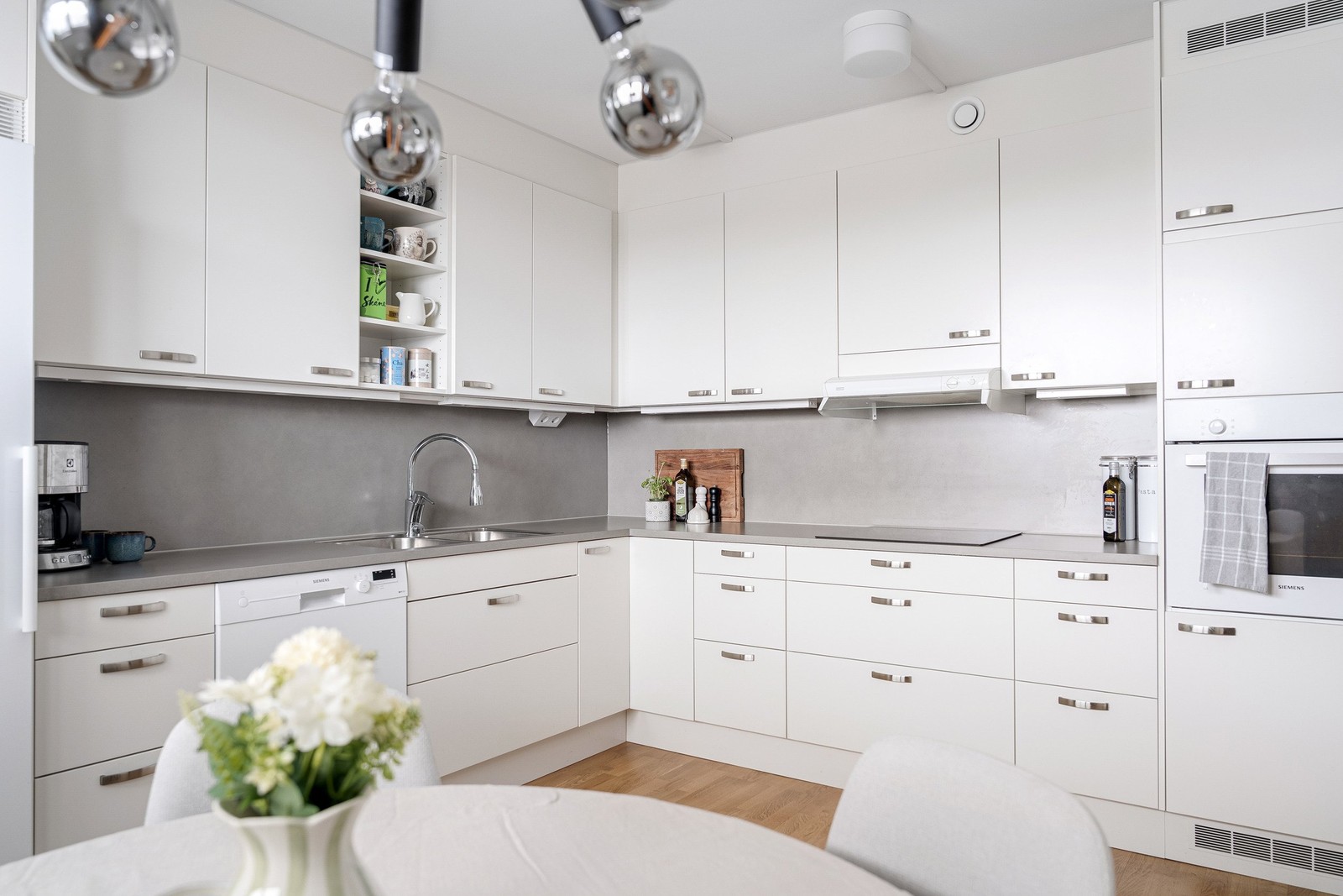 KÖK - Superfint Marbodal kök med släta vita luckor, grå laminatbänkskiva och goda förvaringsmöjligheter. Vitvarorna är från Siemens - diskmaskin, induktionshäll, varmluftsugn, kyl och frys. Kolfilterfläkten är från (Franke). Här finns det gott om plats för större matbord vid fönsterpartiet. Släta vitmålade väggar och parkettgolv.