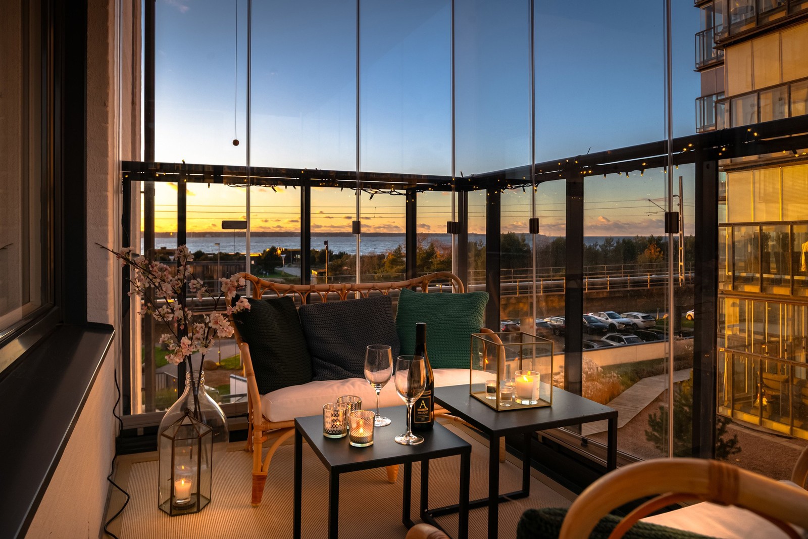 Inglasad balkong om 7 m² med klinkergolv och plisségardiner till samtliga glaspartier, kvällssol och ljuvlig utsikt över Öresund och grönska.