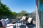 Altandörrarna kan stå på vid gavel ut mot sommarkvällens fågelsång och blomdoft. Här ligger en träterrass, delvis under tak omfamnad av ribbstaket och grönska. Öresund glittrar till mellan träden och den höga platsen öppnar panoramat i 180 grader. Terrassen har en bred, eldriven markis som skyddar mot både sol och regn.