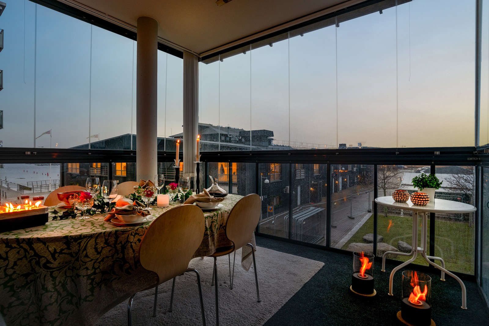 - Stor inglasad balkong om 10 kvm i sydvästläge med öppningsbara fönsterpartier i samtliga fyra väderstreck. Infravärme och solskyddsgardiner.