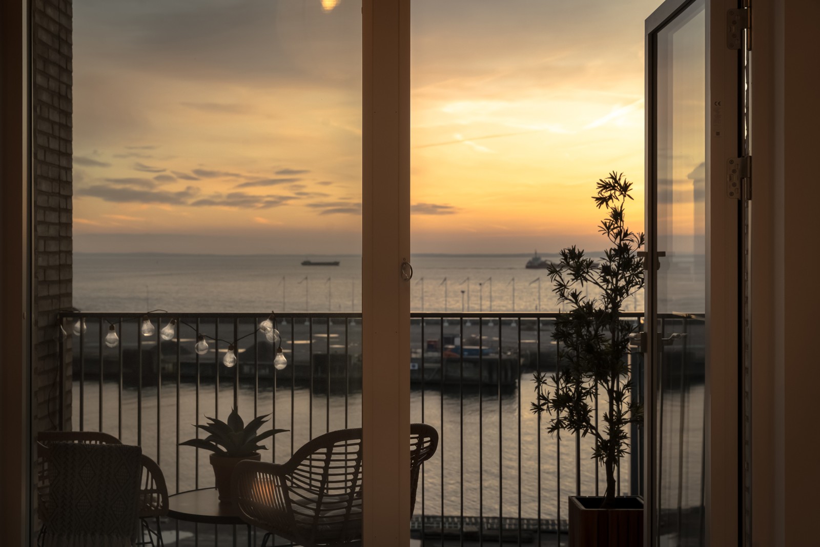 Unik möjlighet till boende Oceanhamnen. Förmodligen den bästa trean i området, med fri sundsutsikt i väst och utsikt över staden i öst, med en balkong i varje riktning.