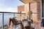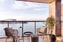 Balkong med trätrall och glasräcke precis invid kajen med sundsutsikt.