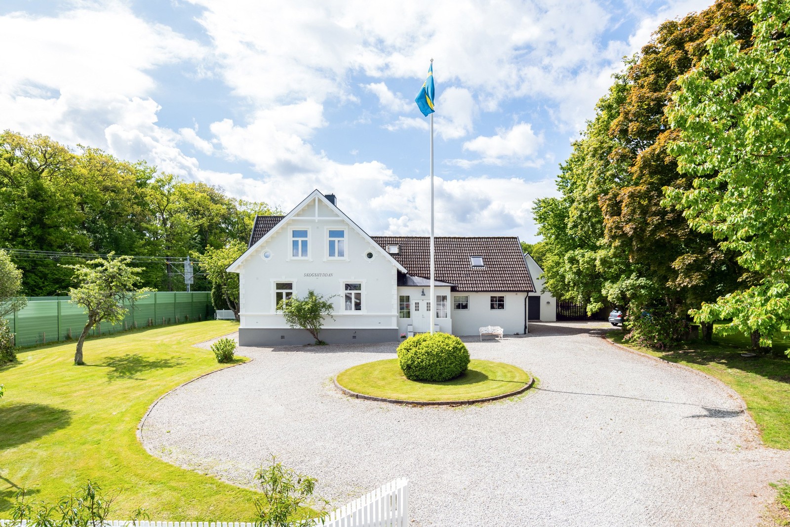 Alldeles intill skogen och naturreservatet ligger denna representativa villa med underbar närhet till långa promenader i skogen. Redan vid infarten möts ni av en välkomnande gårdsrondell med vacker flaggstång i centrum – en detalj som sätter tonen för resten av fastigheten. Villan är placerad en bit in på den generösa tomten vilket ger både lugn, avskildhet och ett praktfullt första intryck. Här finns gott om plats för bilar med både garage och flertalet parkeringsplatser på den rymliga gårdsplanen.