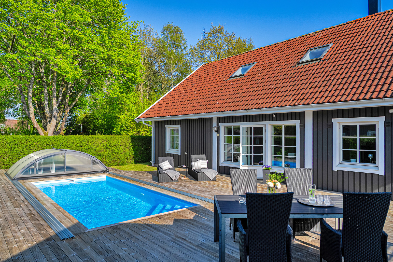 Charmig trävilla med pool, altandäck och rum för hela familjen – en plats att trivas på!