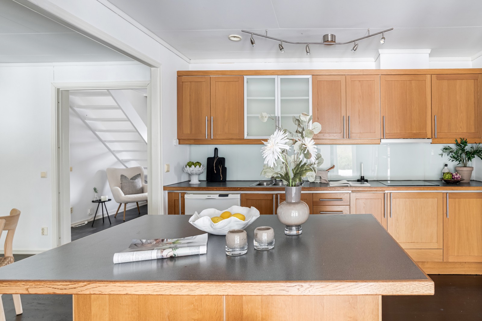 KÖK - Fint kök som är öppet mot vardagsrummet med inbjudande köksö - som gjort för härliga middagar och tillställningar! Stomme från Ballingslöv och köksluckor i ek från Ikea. Glasskiva ovan bänkskiva. Målade väggar och parkettgolv. Diskmaskin, inbyggd ugn, inbyggd mikro, induktionshäll, kyl och frys (side-by-side). Härifrån dukar ni även smidigt ut till trädgårdssidan.