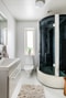 BADRUM - Stort badrum med Fibo Trespo badrumspanel och klinkergolv med golvvärme (el). Bastu, dusch, badkar, handfat och toalett.