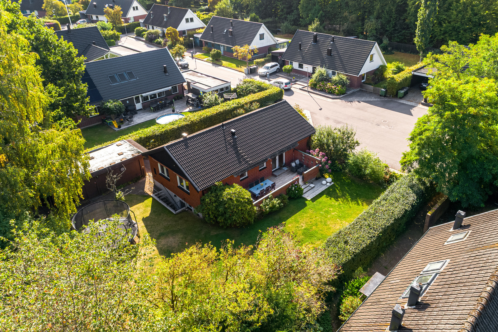 Trädgården är lummig och välskött med gott om plats för både lek, odling och sociala stunder. Här finns uteplatser där man kan njuta av solen större delen av dagen, samtidigt som insynsskyddet skapar en privat oas. Att huset ligger längst ut på återvändsgatan gör läget extra attraktivt, då det är fritt från genomfartstrafik och erbjuder en stillsam boendemiljö som är idealisk för barnfamiljen.