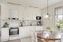 KÖK - Vita luckor och vitt kakel ovan rostfri bänkskiva. Diskmaskin, kolfilterfläkt, induktionshäll, varmluftsugn, kyl och frys. Plats för matbord vid fönsterpartiet. Släta vitmålade väggar och ljust laminatgolv.