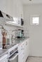 KÖK - Vita luckor och vitt kakel ovan rostfri bänkskiva. Diskmaskin, kolfilterfläkt, induktionshäll, varmluftsugn, kyl och frys. Plats för matbord vid fönsterpartiet. Släta vitmålade väggar och ljust laminatgolv.