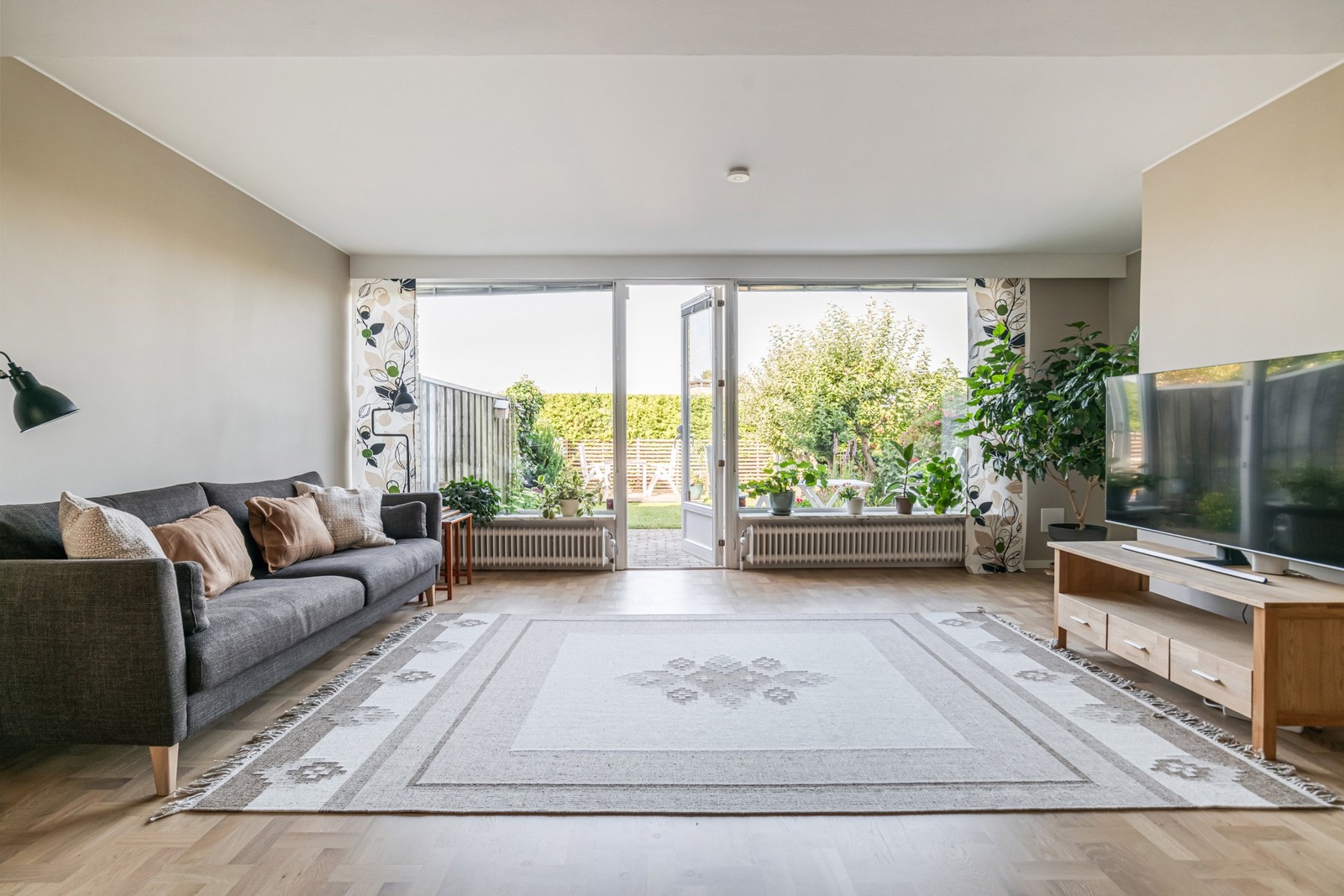 Vardagsrummet har förlängts genom en tillbyggnad som ger extra rymd. Stora fönster släpper in gott om dagsljus, och kaminen i mitten av rummet bidrar både med värme och en ombonad känsla. Här finns gott om plats för både soffgrupp och matbord.