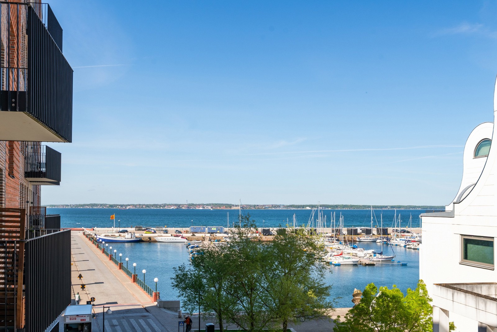 Från vardagsrummet kliver du ut på lägenhetens balkong, där det svarta smidesräcket ramar in en milsvid utsikt över Öresund. Från tidig morgonsol till kvällens sista glöd – detta är en plats för frukostar i mjuk morgonsol och vin under glittrande stjärnhimmel. Att bo här är att ha första parkett till varje solnedgång.