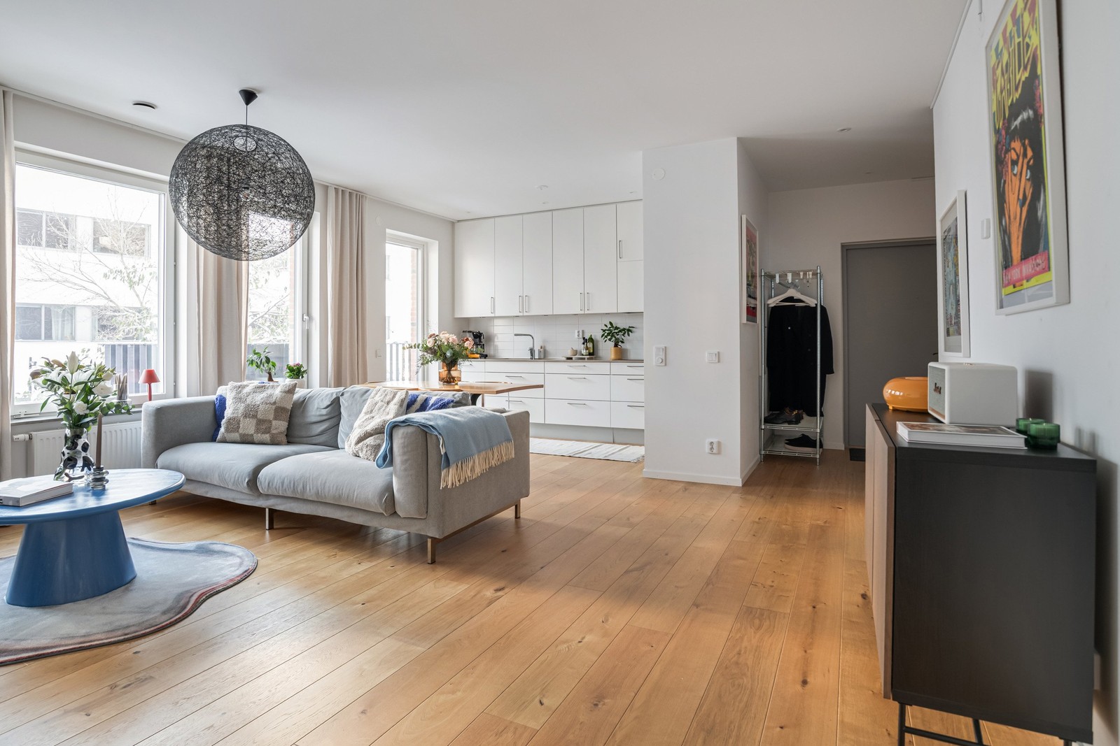 VARDAGSRUM & MATPLATS i öppen planlösning mot kök. 1-stavsparkett.