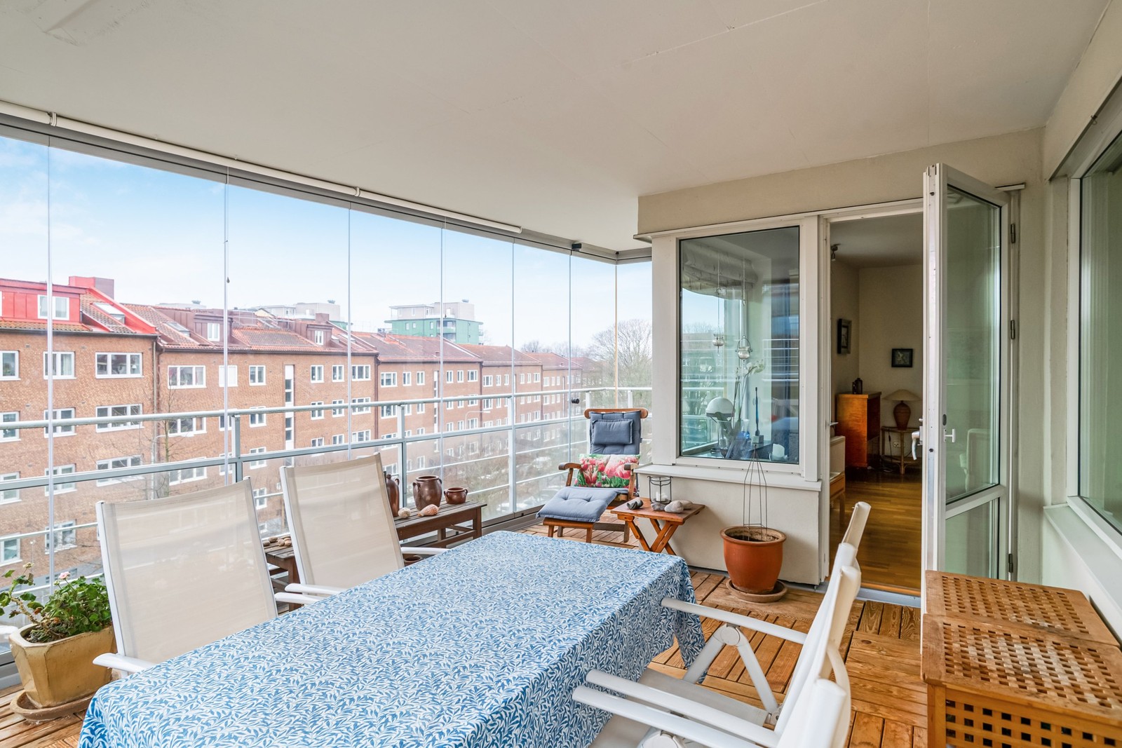 Vardagsrum och kök, tillsammans med den generösa inglasade balkongen, utgör bostadens naturliga samlingspunkt. Den öppna planlösningen ger ett luftigt och inbjudande intryck med gott om plats för både soffgrupp och matsalsmöbel. Bostaden har ett genomgående fint ljusinsläpp från tre väderstreck, vilket bidrar till en ljus och behaglig atmosfär. Balkongen om cirka 20 kvm fungerar som ett extra rum under årets mildare månader, där den skjutbara inglasningen skyddar mot väder och vind utan att ta bort känslan av rymd och ljus.