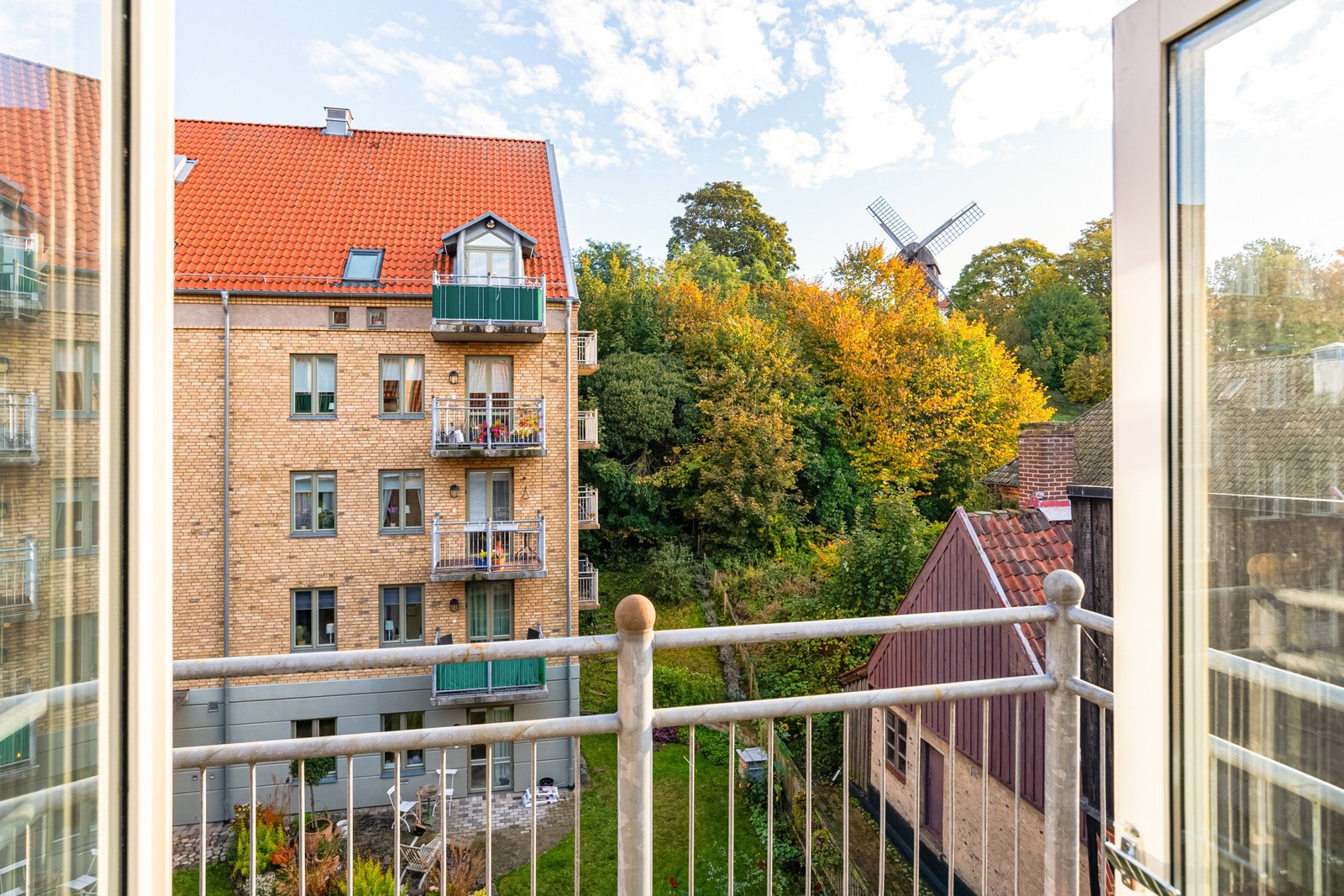 Balkong 2: Generös balkong med utsikt mot den grönskande innergården och upp mot Slottsträdgården, samt en charmig detalj i form av den klassiska väderkvarnen i österläge.