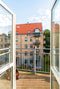Balkong 1: Fransk balkong med vy över Södra Storgatans charmiga och äldre bebyggelse i västerläge.