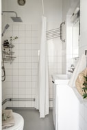Badrummet är beläget i nära anslutning till hallen och är stilrent klätt med vitt kakel på väggarna och en tålig grå plastmatta på golvet.