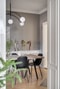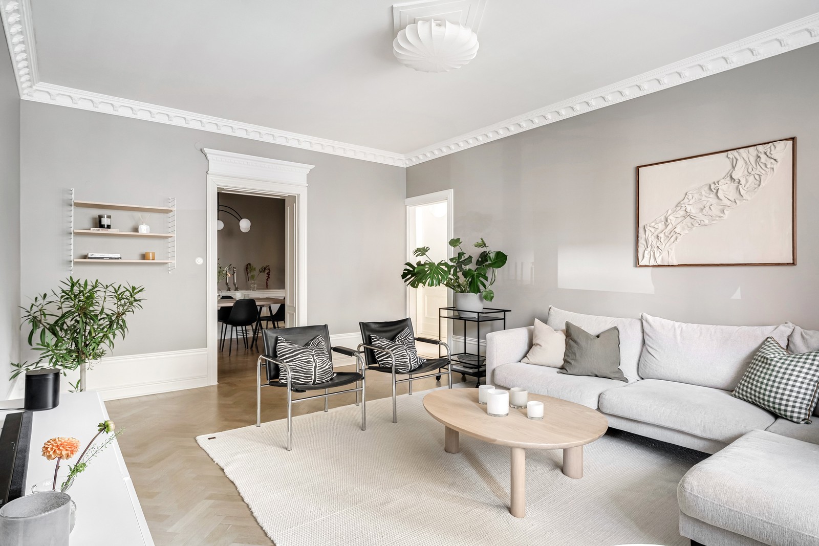 Väggarna är genomgående släta och målade och i större delen av bostaden vilar vacker fiskbensparkett. Genomgående i lägenheten anas flertalet detaljer från fastighetens byggår med originaldetaljer som djupa fönsterbänkar, takrosetter och bröstpanel som förstärker den trivsamma känslan som genomsyrar hela hemmet.